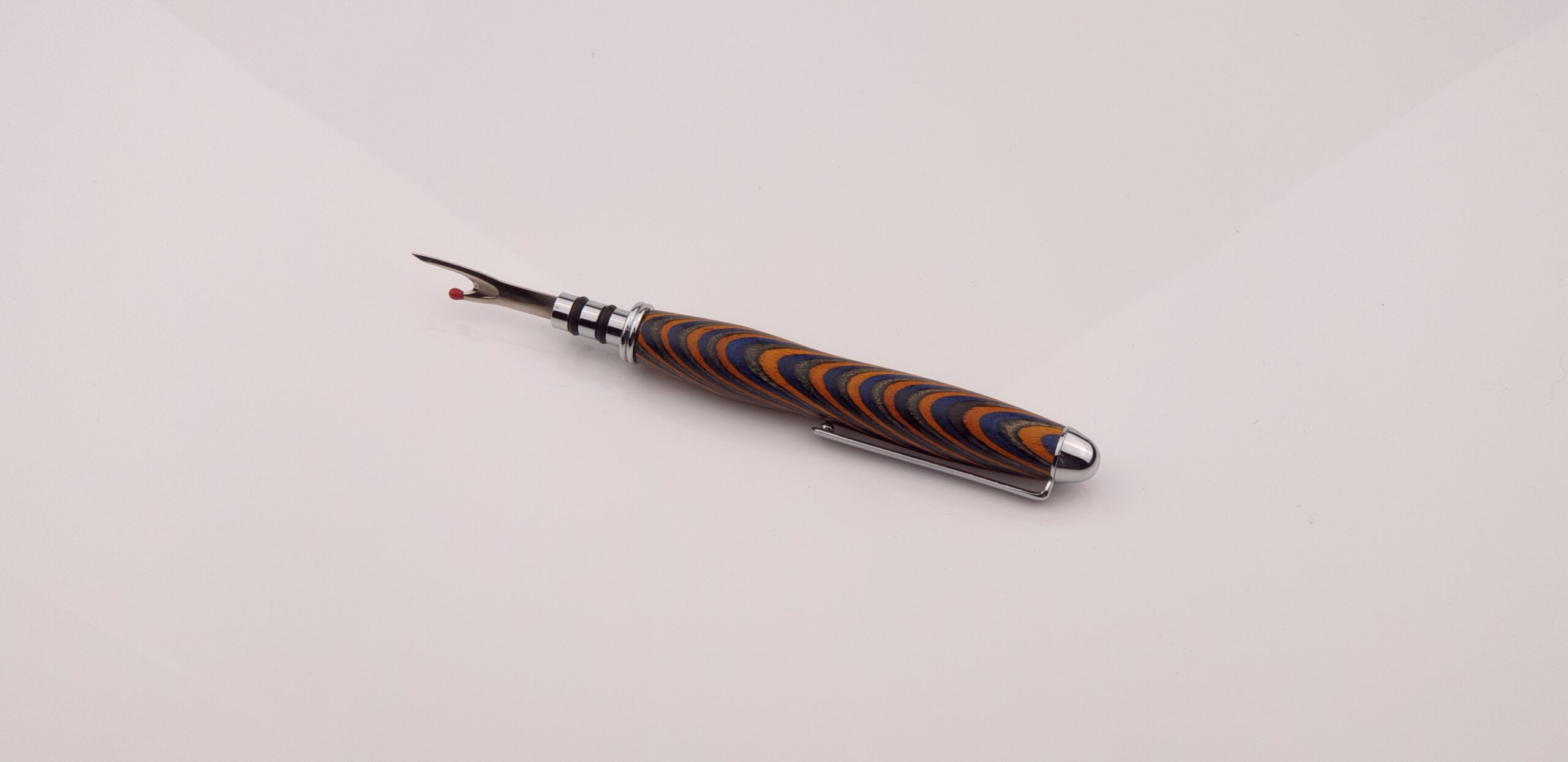 The seam ripper is made with Blue & Gold Dyed Maple Laminates from North America, and is supplied in a velvet pouch.